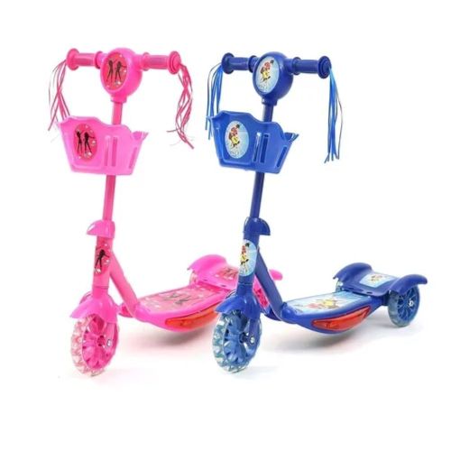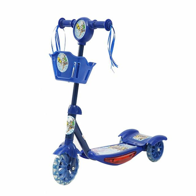 Monopatin Scooter con canasto y porras decorativas. Luces Laterales. Sonido. Ruedas siliconadas y grandes (1 delante y 2 detras). Utiliza 3 pilas 'AAA' NO incluidas.