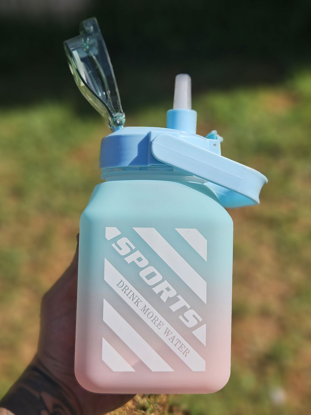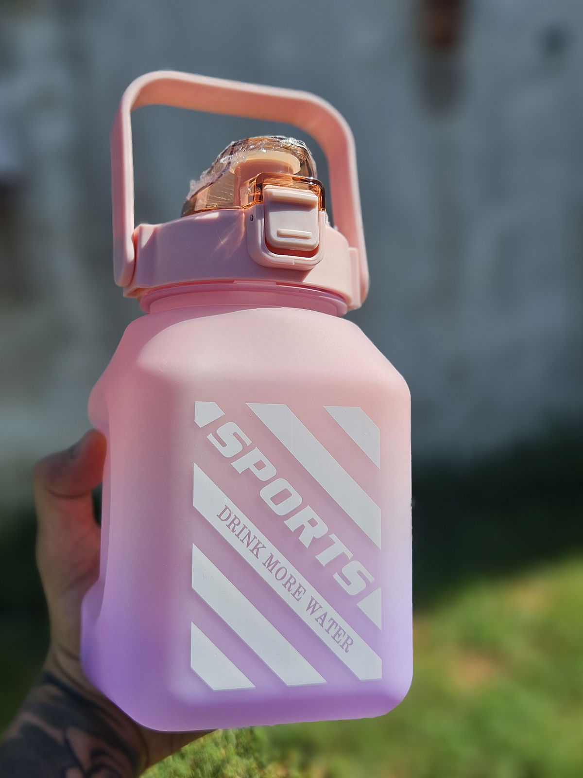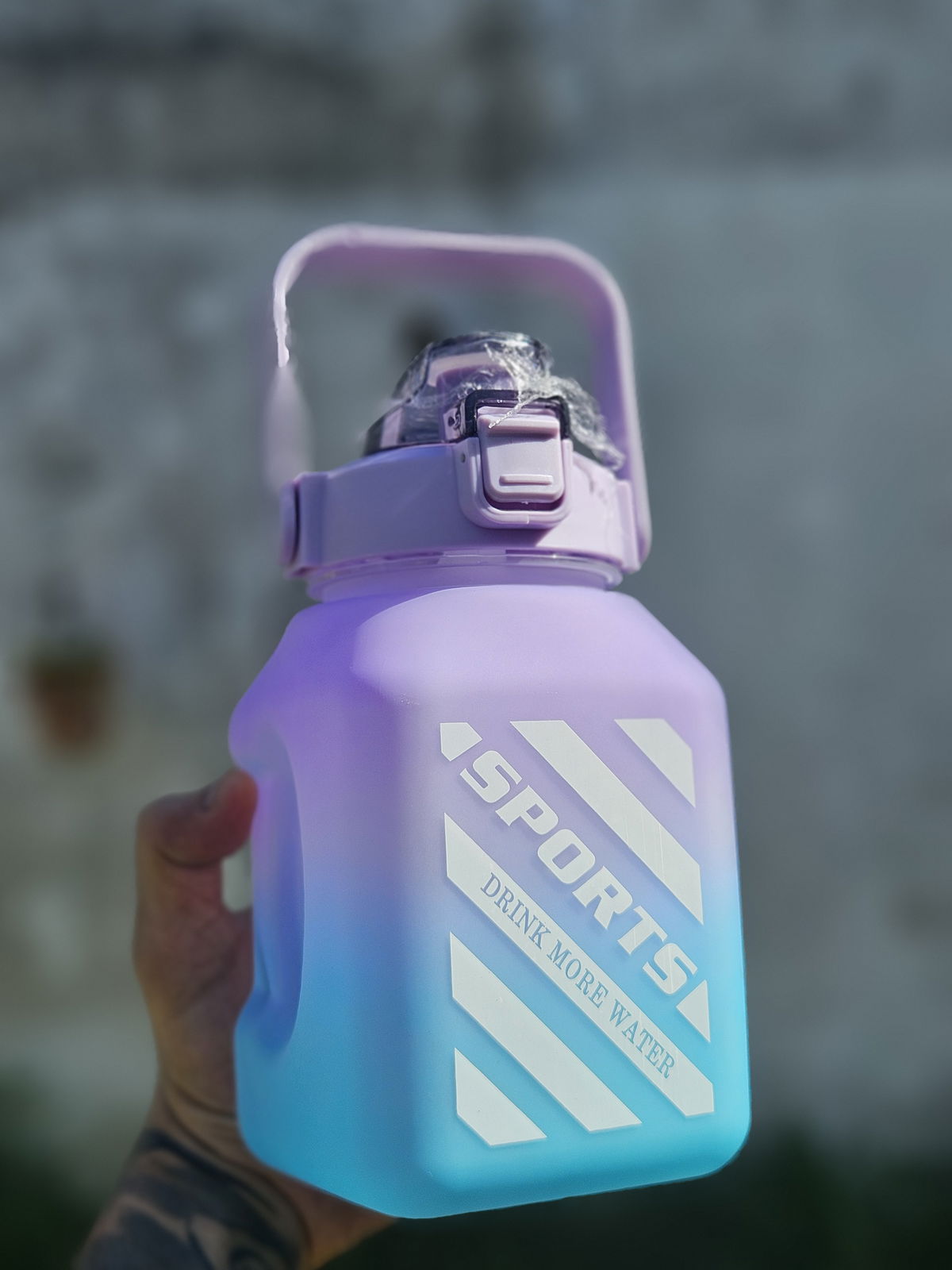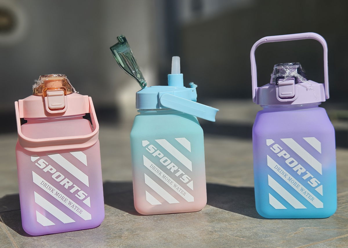 Botella de 1.5L con pico, manija y correa.